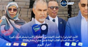 أشرف الأمين العام لوزارة العمل الاجتماعي والطفولة والأسرة، السيد حمودي شيخنا عالي، اليوم الخميس بمقاطعة الميناء، على تسلم كميات كبيرة من الأسماك لصالح الفئات الهشة، ضمن عملية رمضان2026 مقدمة من طرف الشركة الموريتانية لتوزيع الأسماك التابعة لوزارة الصيد والبنى التحتية البحرية والمينائية. وتبلغ الكمية 12 طنا، خُصصت لمساعدة الأسر المتعففة والتخفيف من أعبائها خلال شهر رمضان المبارك. وفي تصريح صحفي …