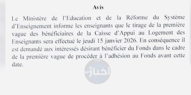 ترفع وزارة التربية وإصلاح النظام التعليمي إلى علم المدرسين أن سحب لائحة الدفعة الأولى من المستفيدين من صندوق دعم سكن المدرسين سيتم يوم الخميس 15 يناير 2026. وبناء عليه يرجى من المعنيين الراغبين في الاستفادة من الصندوق ضمن الدفعة الأولى المبادرة إلى التسجيل قبل هذا التاريخ.